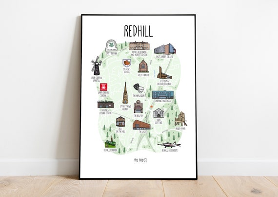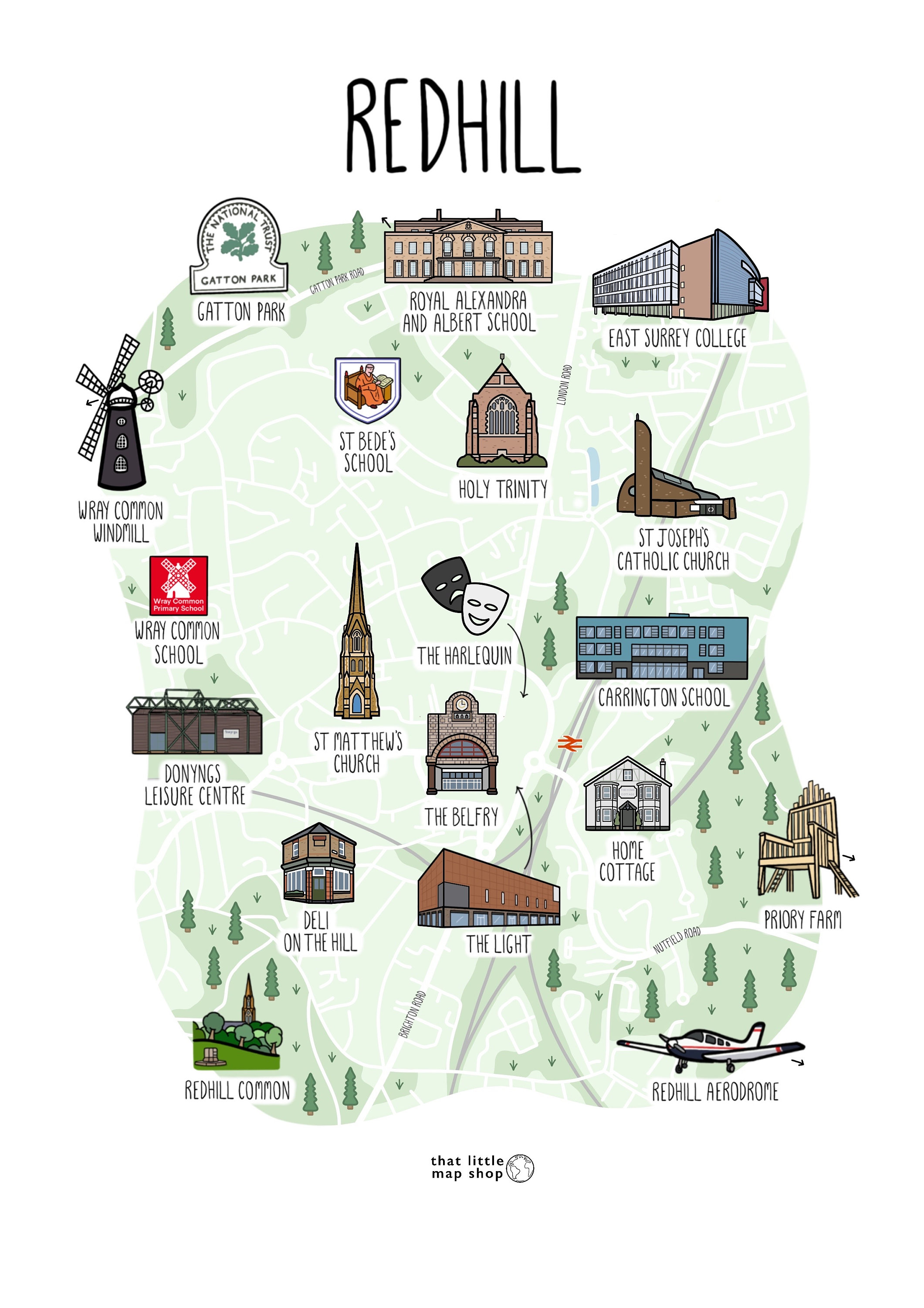 Map of Redhill Illustrated Map of Redhill Surrey Map Print Surrey