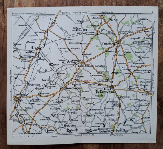 1908 Antique Cambridgeshire/suffolk Road Map. Original Map Print