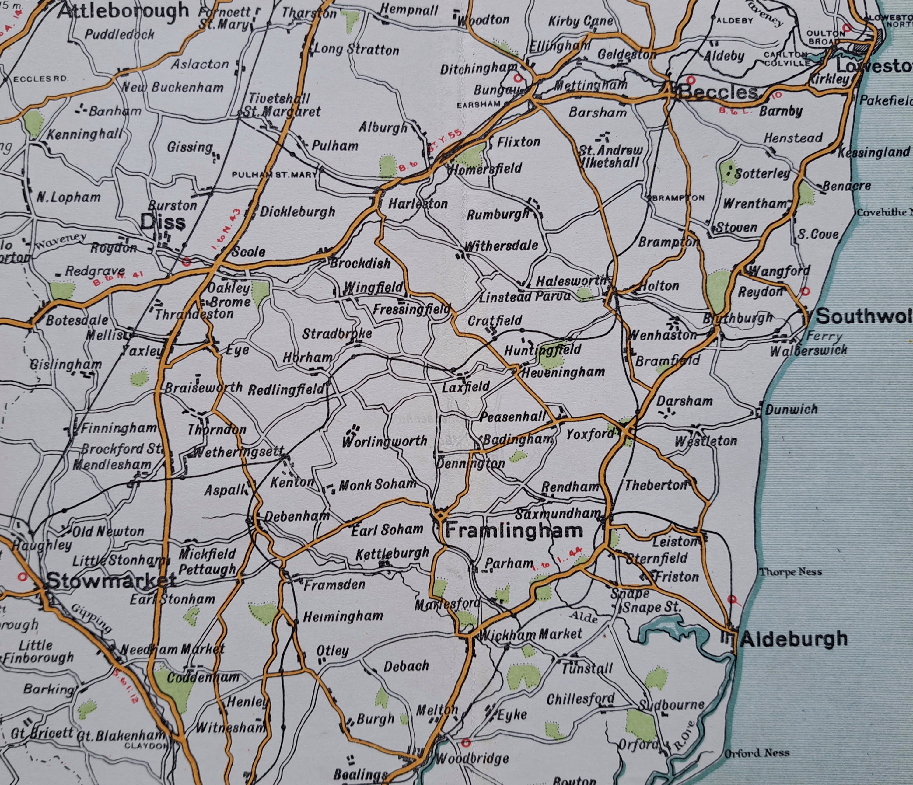 1908 antique Suffolk road map. Southwold, Aldeburgh, Framingham